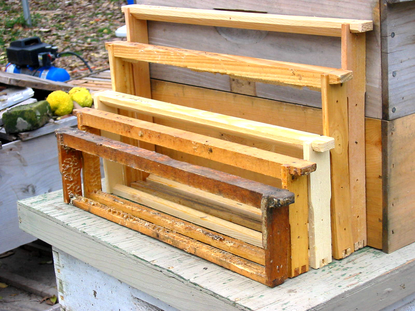 Solo acuérdese, si no tiene entrada en la parte inferior y usa un excluidor (que yo no uso) necesitará algún tipo de escape para los zánganos. Un agujero de 3/8" (10mm) funciona. Más detalles en el Capítulo Entradas Superiores ____________________________________ Marco de tamaños uniformes."Cualquier estilo de colmena que adopte, que sea de marcos móviles y de un solo tamaño de marco en el apiario."--A.B. Mason, Mysteries of Bee-keeping explained El marco es el elemento básico de una colmena moderna. Incluso si tiene cajas de varios tamaños (en el sentido de la cantidad de marcos que albergan) si los marcos son todos de la misma profundidad, puede colocarlos en cualquiera de sus cajas. Tener un tamaño uniforme de marcos ha simplificado mi vida. Si todos sus marcos son del mismo tamaño tendrá muchas ventajas. Puede colocar casi cualquier cosa en las colmenas donde las necesite. Por ejemplo: