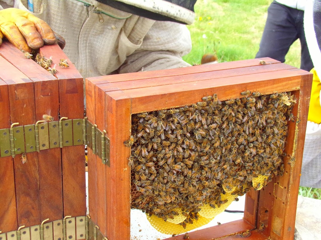 (footnote on figure: The leaf or book hive consists of twelve vertical frames or boxes, parallel to each other, and joined together. Fig. 1. the sides, f f. f g. should be twelve inches long (30 cm), and the cross spars, nine or ten (approximately 23 to 25 cm) the thickness of these spars an inch (2.5 cm), and their breadth fifteen lines (1 line=1/12th in. 15 lines=1 1/4 in.=32mm). It is necessary that this last measure should be accurate; a piece of comb which guides the bees in their work; d. a movable slider supporting the lower part; b b. pegs to keep the comb properly in the frame or box; four are in the opposite side; e e. pegs in the sides under the movable slider to support it. A book hive, consisting of twelve frames, all numbered, is represented fig. 2. Between 6 and 7 are two cases with lids, that divide the hive into two equal parts, and should only be used to separate the bees for forming an artificial swarm; a, two frames which shut up the two sides of the hive, have sliders, b. b. The entrance appears at the bottom of each frame. All should be close but 1 and 12. However it is necessary that they should open at pleasure. The hive is partly open, fig. 3. and shows how the component parts may be united by hinges, and open as the leaves of a book. The two covers closing up the sides, a. a Fig. 4. is another view of fig. 1. a a. a piece of comb to guide the bees; b b. pegs disposed so as to retain the comb properly in the frame; c c. parts A. of two shelves; the one above is fixed, and keeps the comb in a vertical position; the under one, which is movable, supports it below.) ____________________________ TRANSLATOR'S PREFACE THE facts contained in this volume are deeply interesting to the Naturalist. They not only elucidate the history of those industrious animals, whose nature is the peculiar subject of investigation, but they present some new and singular features in physiology which have hitherto been unknown. The industry of bees has proved a fertile source of admiration in all countries and in every age; and mankind have endeavoured to render it subservient to their gratifications or emolument. Hence innumerable theories, experiments, and observations have ensued, and uncommon patience has been displayed in prosecuting the enquiry. But although many interesting peculiarities have been discovered, they are so much interwoven with errors, that no subject has given birth to more absurdities than investigations into the history of bees: and unfortunately those treatises which are most easily attained, and the most popular, only serve to give such absurdities a wider range, and render it infinitely more difficult to eradicate them. A considerable portion of the following work is devoted to this purpose. The reader will judge of the success which results from the experiments that have been employed. Perhaps this is not the proper place to bestow an encomium on a treatise from which so much entertainment and instruction will be derived. However, to testify the estimation in which it is held in other nations, the remarks upon it by the French philosipher Sue, may be quoted, "The observations are so consistent, and the consequences seem so just, that while pending this work, it appears as if we had assisted the author in each experiment, and pursued it with equal zeal and interest. Let us invite the admirers of nature to read these observations; few are equal to them in excellence, or so faithfully describe the nature, the habits and inclinations of the insects which they treat." It is a remarkable circumstance that the author laboured under a defect in the organs of vision, which obliged him to employ an assistant in his experiments. Thus these discoveries may be said to acquire double authority. But independent of this the experiments are so judiciously adapted to the purposes in view, and the conclusions so strictly logical, that there is evidently very little room for error. The talents of Francis Burnens, this philosophic assistant, had long been devoted to the service of the author, who, after being many successive years in this manner aided in his research, was at last deprived of him by some unfortunate accident. Whether the author has prosecuted his investigation farther does not appear, as no other production of his pen is known in this island. (Transcriber's Note: Another volume of Huber's work with bees was published in French in 1814) It is vain to attempt a translation of any work without being to a certain degree skilled in the subject of which it treats. Some parts of the original of the following treatise, it be acknowledged, are so confused, and some so minute that it is extremely difficult to give an exact interpretation. But the general tenor, though not elegant, is plain and perspicuous and such has it been here retained. ____________________________ THE IMPREGNATION OF THE QUEEN BEE SIR, -(All these letters are addressed to the celebrated Naturalist M. Bonnet.-T.) WHEN I had the honour at Genthod of giving you an account of my principal experiments on bees, you desired me to transmit a written detail, that you might consider them with greater attention. I hasten, therefore, to extract the following observations from my journal. As nothing can be more flattering to me than the interest you take in my researches, permit me to remind you of your promise to suggest new experiments. After having long studied bees in glass hives constructed on M. de Réaumur's principle, you have found the form unfavourable to an observer. The hives being too wide, two parallel combs were made by the bees, consequently whatever passed between them escaped observation. From this inconvenience, which I have experienced, you recommended much thinner hives to Naturalists, where the panes should be so near each other, that only a single row of combs could be erected between them. I have followed your admonitions, Sir, and provided hives only eighteen lines in width (1 line=1/12th in. 18